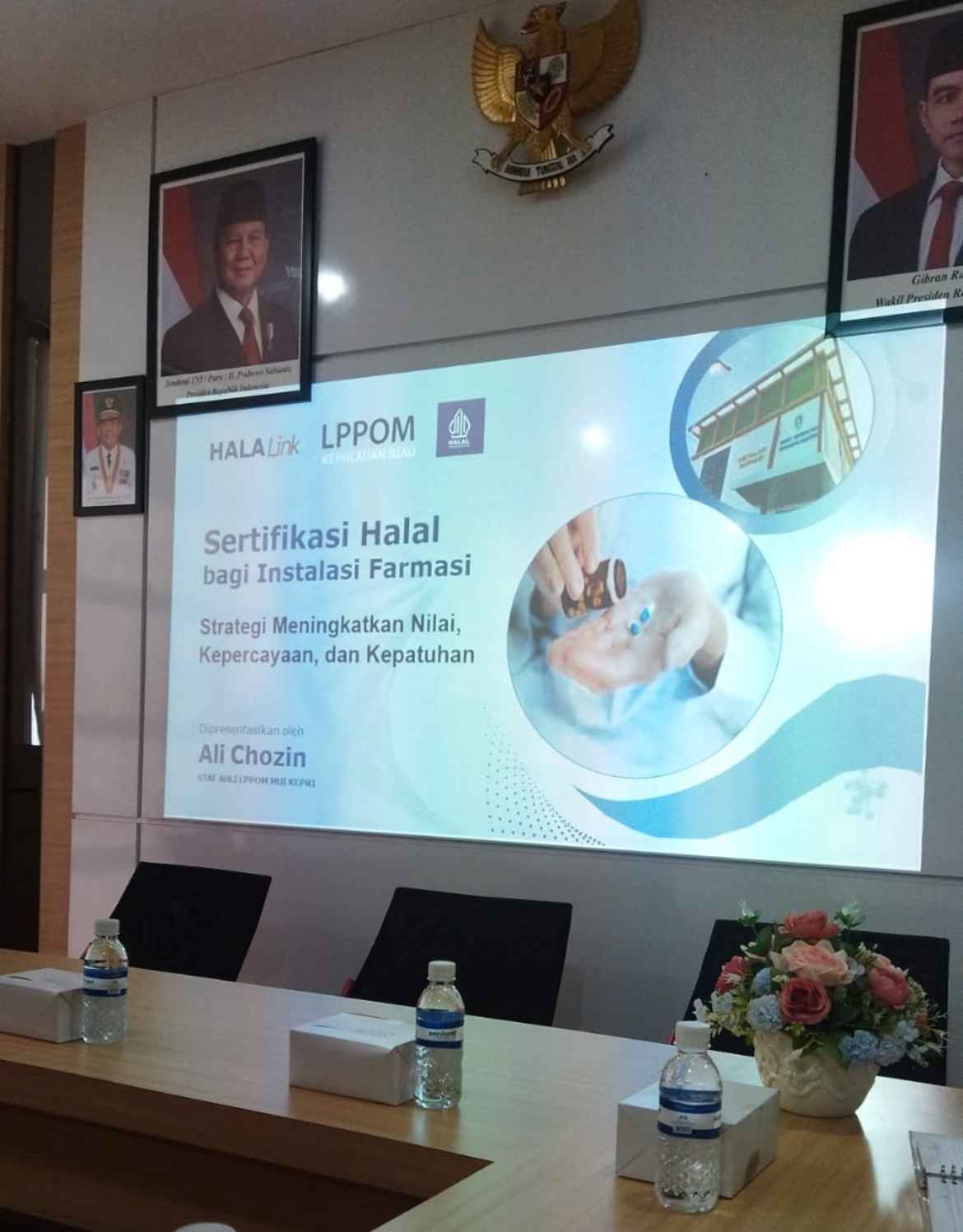 Sosialisasi Sertifikasi Halal Instansi disampaikan oleh Staf Ahli LPPOM MUI Provinsi Kepulauan Riau, Bapak Drs. Ali Chosin, Apt, M. Si. Persiapan persyaratan terkait pemenuhan data dukung pemenuhan Sertifikasi Halal Instansi. Kegiatan dilaksanakan pada hari / tanggal : Rabu, 24 September 2025, waktu : 10.00 WIB s.d selesai, tempat : UPTD Instalasi Farmasi Dinas Kesehatan Provinsi Kepulauan Riau Tugu Provinsi Kepulauan Riau dekat Taman Migas Komplek Perkantoran Pemerintah Prov. Kepulauan Riau Dompak Tanjungpinang.