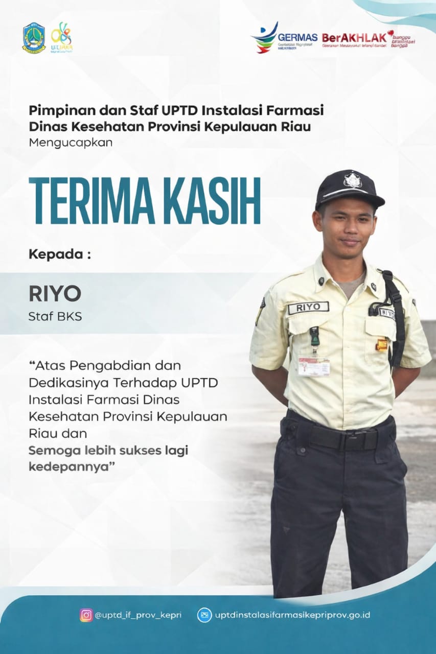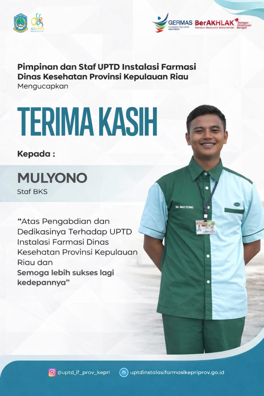 Selama menjalankan tugas, Mulyono telah berperan penting dalam menjaga kebersihan, kerapian, dan kenyamanan lingkungan kerja, sementara Riyo senantiasa menjalankan tugas pengamanan dengan penuh tanggung jawab dan kedisiplinan. Kontribusi keduanya menjadi bagian tak terpisahkan dalam mendukung kelancaran operasional dan aktivitas di UPTD Instalasi Farmasi Dinas Kesehatan Provinsi Kepulauan Riau.