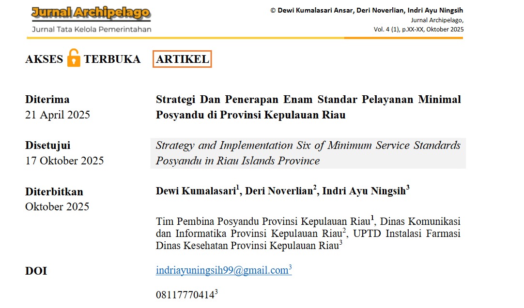 Kami menyampaikan kabar gembira: artikel ilmiah berjudul “Strategi dan Penerapan Enam Standar Pelayanan Minimal Posyandu di Provinsi Kepulauan Riau” yang ditulis oleh Dewi Kumalasari, Deri Noverlian, dan Indri Ayu Ningsih telah diterbitkan di Jurnal Archipelago (Vol. 4, No. 1, Oktober 2025, hlm. XX–XX). Artikel ini menghadirkan analisis komprehensif mengenai implementasi standar layanan inti Posyandu di konteks kepulauan dengan fokus pada tantangan praktis, strategi adaptasi, dan rekomendasi kebijakan yang dapat memperkuat layanan primer bagi balita, ibu hamil, dan keluarga.