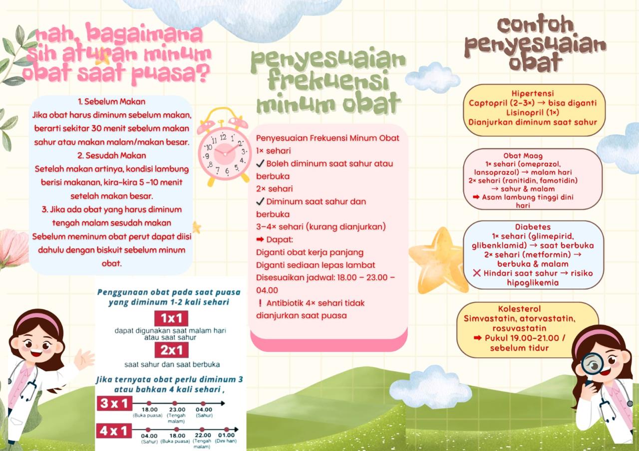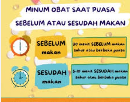 Kami mengimbau masyarakat untuk menyesuaikan jadwal minum obat selama puasa sesuai anjuran tenaga kesehatan. Obat yang biasanya diminum tiga kali sehari dapat disesuaikan waktunya menjadi saat sahur, berbuka puasa, dan sebelum tidur, dengan memperhatikan jarak waktu yang cukup. Sementara itu, obat dua kali sehari dapat diminum saat sahur dan berbuka puasa, serta obat satu kali sehari dapat diminum pada malam hari sesuai petunjuk penggunaan.