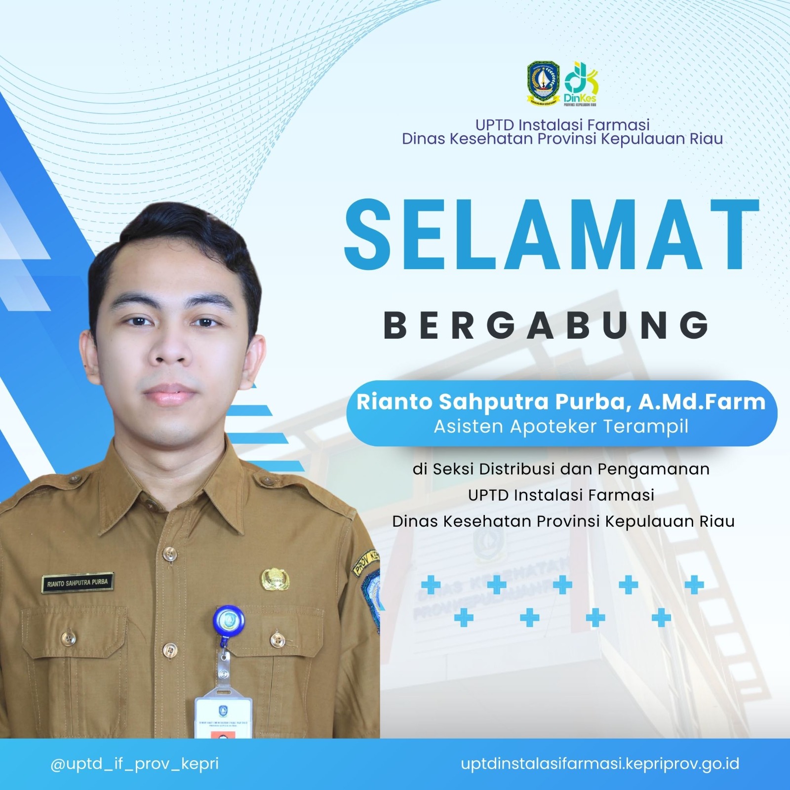 KABAR BAIK .... TELAH BERGABUNG ASISTEN APOTEKER TERAMPIL "RIANTO SAHPUTRA PURBA, A.Md. Farm" PADA SEKSI DISTRIBUSI DAN PENGAMANAN UPTD INSTALASI FARMASI DINAS KESEHATAN PROVINSI KEPULAUAN RIAU.